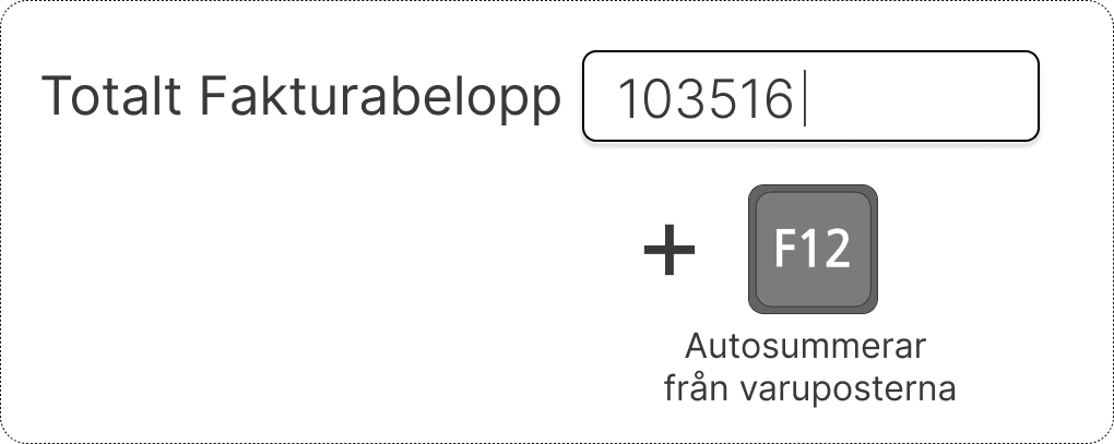 För smidig hantering av fakturerat totalbelopp och faktureringsvaluta finns det sedan tidigare funktionalitet i LIS för att automatiskt få fram dessa. Registrera först samtliga varuposter färdigt. Ställ er därefter i fältet Totalt fakturabelopp och tryck F12. Då summerar LIS varans pris från samtliga varuposter samt lyfter in valutakoden då samma är registrerad på samtliga varuposter.